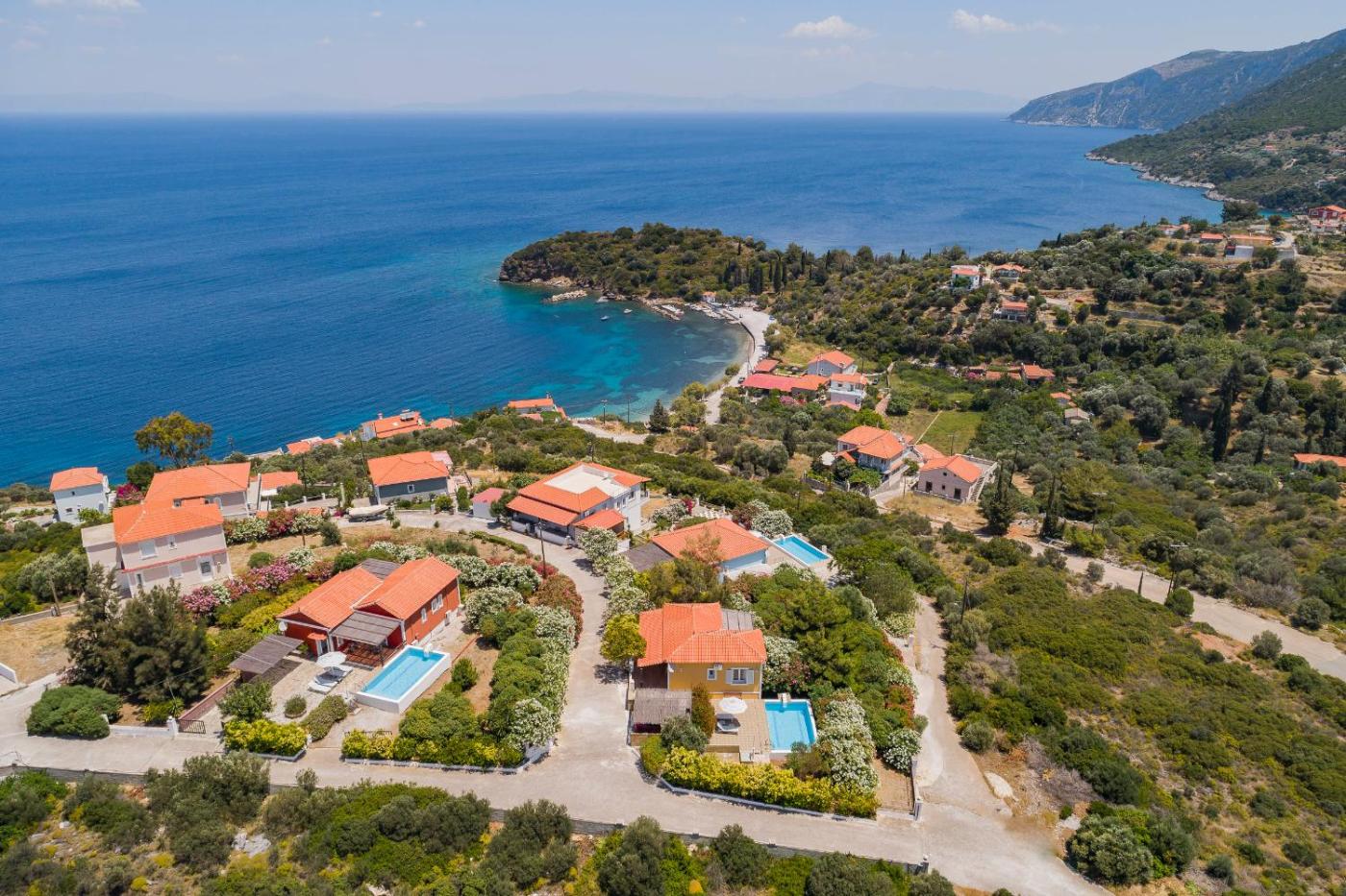 House 1- Two-Bedroom Villa with Private Pool (2-6 Adults). 200 metres from the beach, this spacious, well-equipped villa offers private swimming pool and balcony overlooking the sea and the mountains. Offers free Wi-Fi and fully equipped kitchen with stove, fridge and dining table. ;