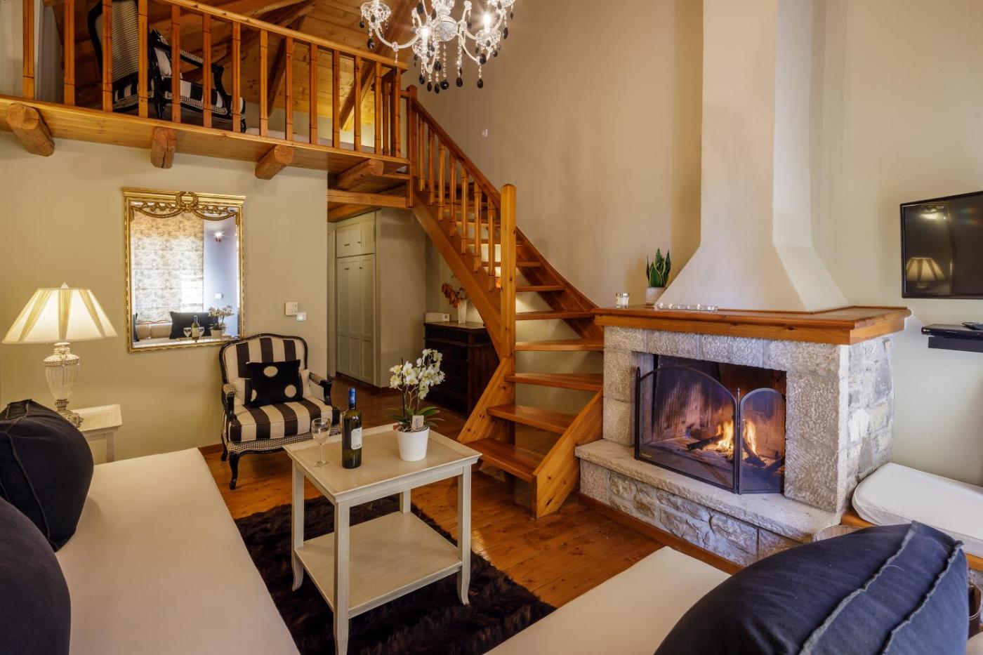 Superior Suite. Spacious, individually decorated split-level suite. It features: -free WiFi -COCO-MAT bed and pillows -a seating area with a sofa and a fireplace on the ground floor -a terrace with mountain views -a flat-screen TV and a DVD player with movie library -a bathroom with bath, bathrobes and free toiletries -welcome drink and treats. ;