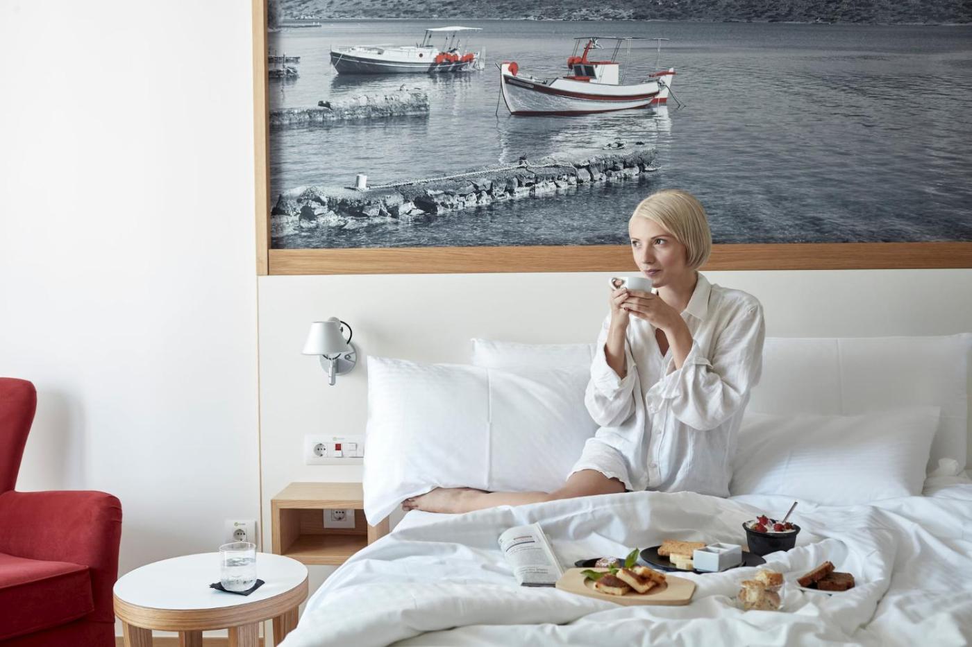 Olive Green Club Elite Room. Located on the 6th floor, Olive Green Club rooms come with cutting edge décor in minimal lines and exquisite architecture. Abundant sunlight brightens the interior, while the terrace is fully furnished, with table, chairs and sun loungers. High-tech facilities include a 49’’ TV, walk-in, high-pressure rain shower, an espresso machine, free WiFi, electronic 15’’ laptop size safe and USB plugs. Teacoffee making facilities are also provided. Guests are welcomed with raki drink, rusks, olives and local sweets. A complimentary tablet, serving you as a guest directory and digital concierge, is available. ;