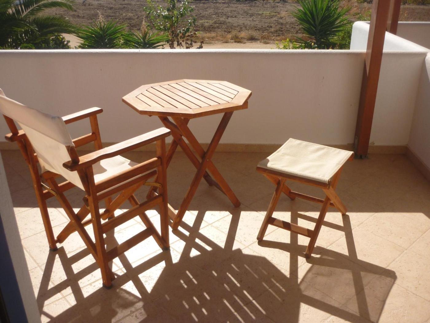 One-Bedroom Apartment (2-3 Adults). Includes a kitchenette with fridge and dining area. The shaded balcony or veranda offers distant views Mikri Vigla Beach. ;