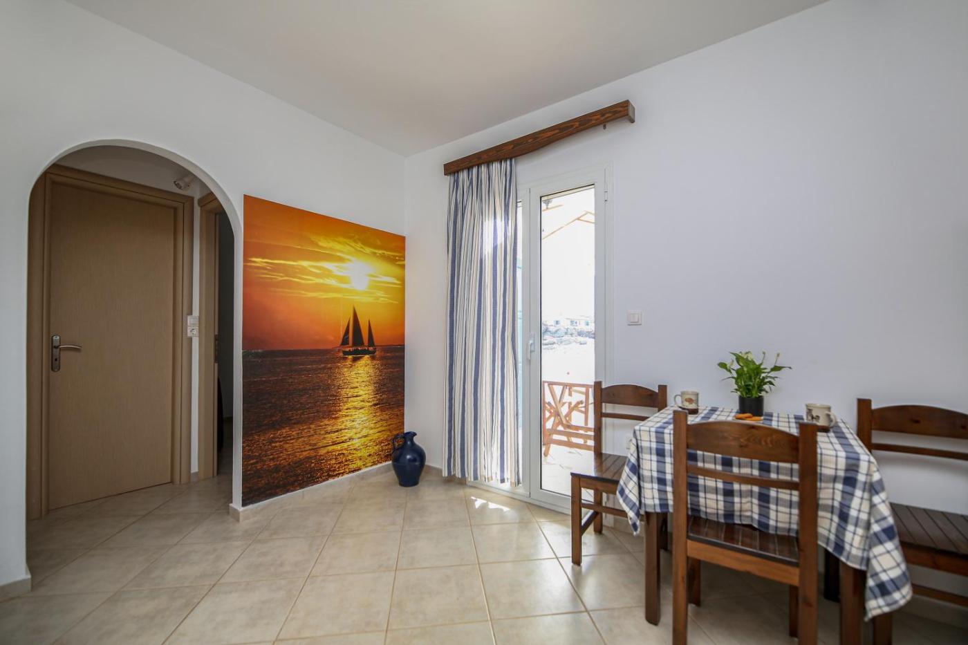 One-Bedroom Apartment (2-4 Adults). Includes a kitchenette with fridge and dining area. The shaded balcony or veranda offers distant views Mikri Vigla Beach. ;
